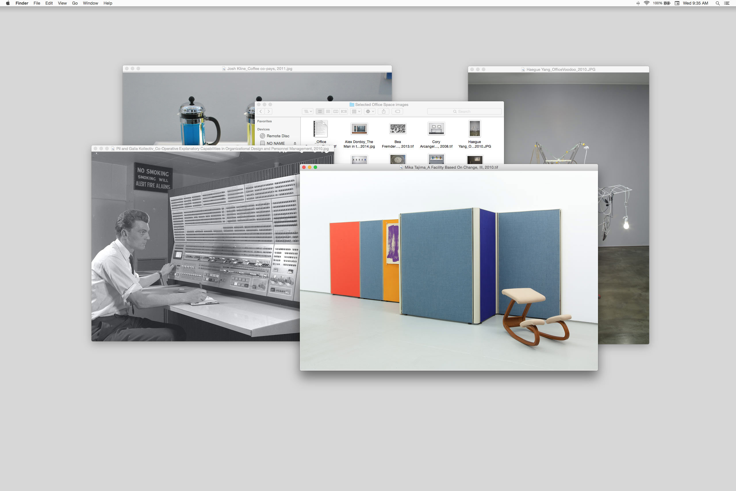 As offices become mobile, the nine-to-five becomes a nonstop 24-hour cycle, and the service and information economy predominates, this exhibition reflects on the rise of "immaterial labor" in developed countries. Through video, sculpture, painting, and installation, the artists in Office Space interrogate universally recognized aspects of office architecture, design, aesthetics, and protocols as a means to understand the shift toward immaterial labor practices.” — Yerba Buena Center for the Arts